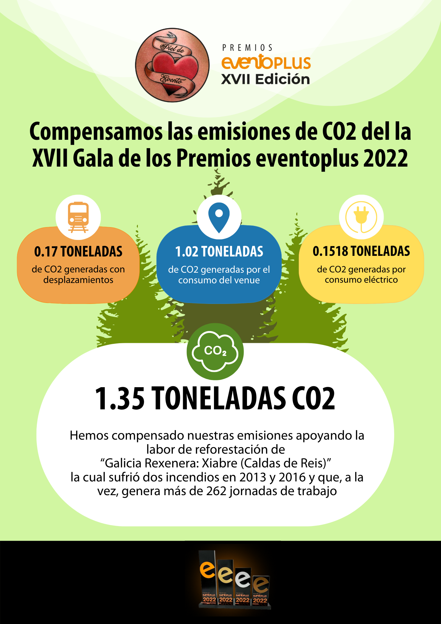 Por eso, calculamos y compensamos la huella de carbono generada durante la celebración de la 17ª edición de la Gala de los Premios eventoplus. En esta ocasión, el cálculo de la emisión de CO2 incluye el desplazamiento del equipo, así como el consumo eléctrico y el resultado total es de 1.3418 toneladas. Sabemos que no están incluidos todos los aspectos en la celebración del evento, pero es un primer paso y ¡lo haremos mejor en los próximos!